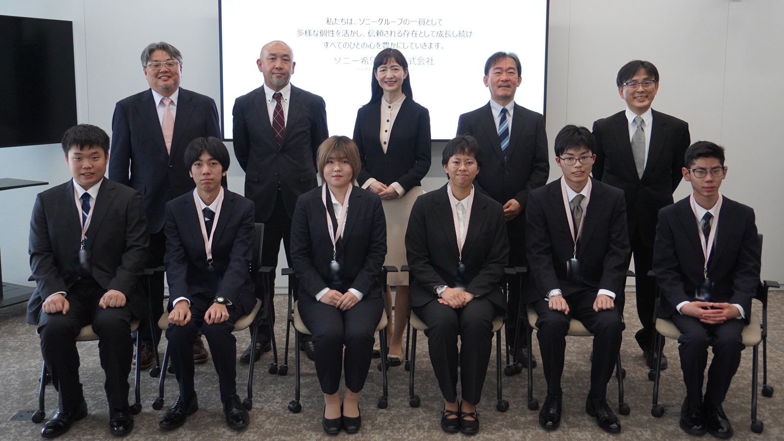 式では緊張感のある空気の中、新卒社員の希望に満ちた表情を見ることができ、 写真撮影時には笑顔も見受けられ和やかな雰囲気となりました。 ソニー希望・光株式会社の社員として、これからの活躍を心より期待しています。